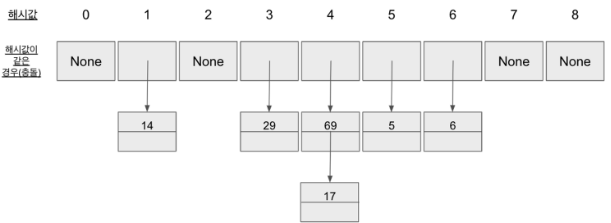 - 과정: key의 해시값 계산 → 해시값에 해당하는 List index를 구함 → 같은 해시값을 가진 key가 있다면(충돌) List로 연결