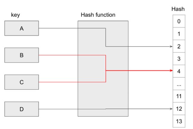 - 💡 B와 C라는 서로 다른 key 값이 해시 함수를 통과 → 4라는 동일한 Hash 값을 부여받게 됨 ⇒ 해시 충돌