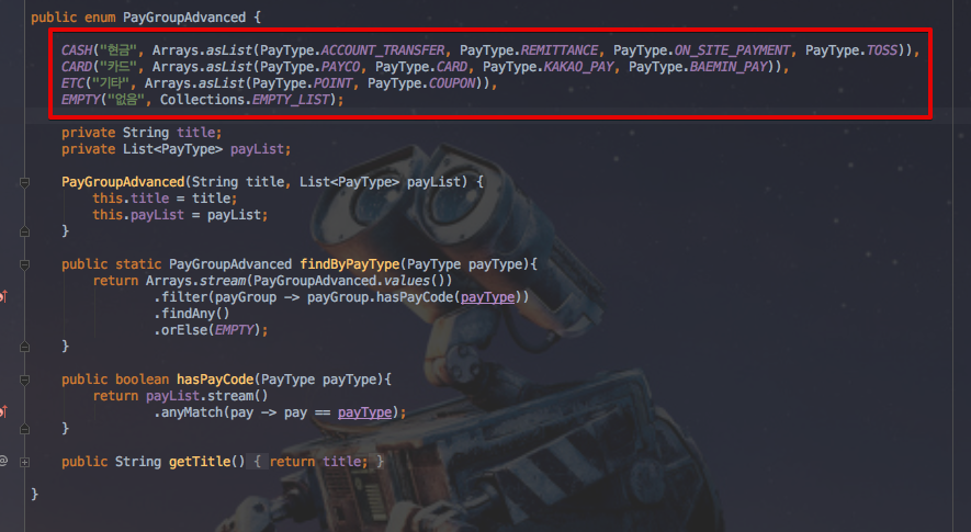 - Java의 enum은 결국 클래스인 점을 이용하여 enum 상수에 결제종류 문자열 리스트로 갖도록 하였습니다.