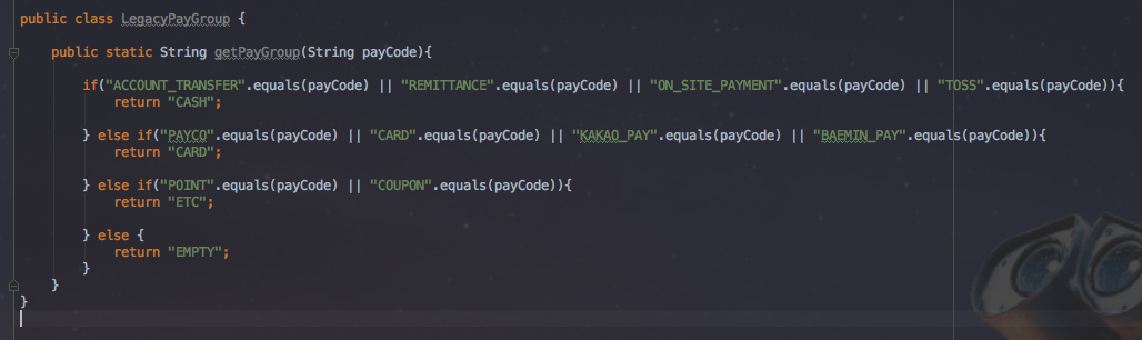 - 결제된 건이 어느 결제 종류에 속하는지 분류할 때 '문자열 + 메소드 + if문' 조합의 기존 방식은 다음과 같은 문제가 있었습니다.