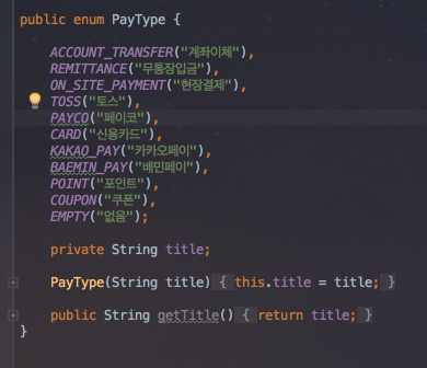 (ex: PayType.ACCOUNT_TRANSFER.getTitle()을 호출하면 "계좌이체" 라는 문자열이 반환됩니다.)