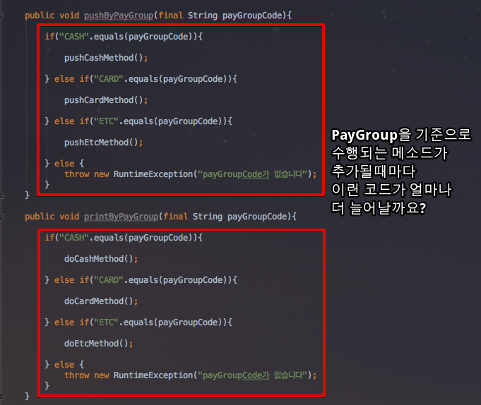 - 결제 종류에 따라 추가 기능이 필요할 경우, 또다시 결제종류에 따른 if문 메소드가 필요하다.
