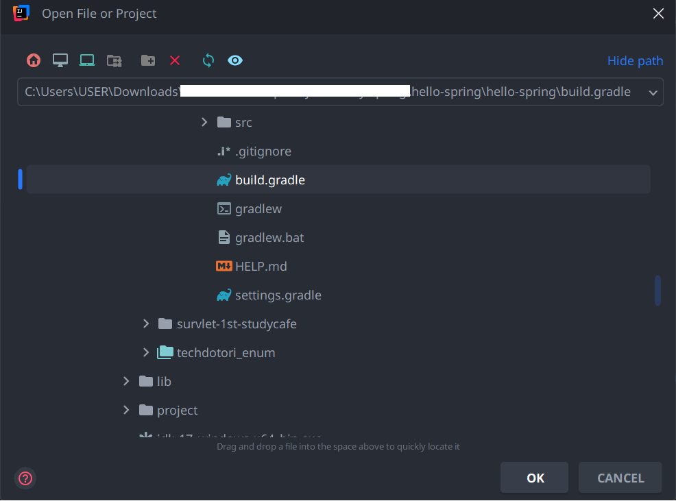 - IntelliJ에서 File > Open > build.gradle을 open합니다.
