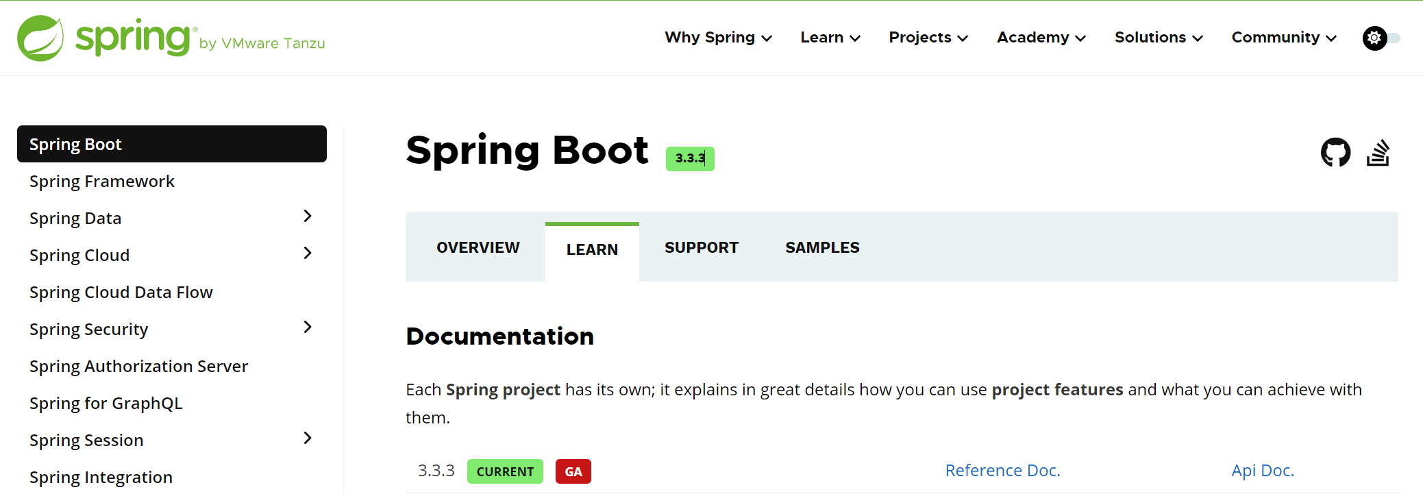 - spring.io > Spring Boot > Learn > 원하는 버전의 Reference Doc.선택합니다.