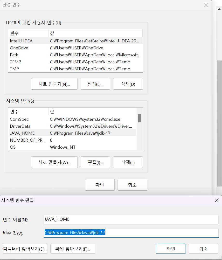 - 고급 → 환경 변수 → JAVA_HOME 시스템 변수를 설정합니다.