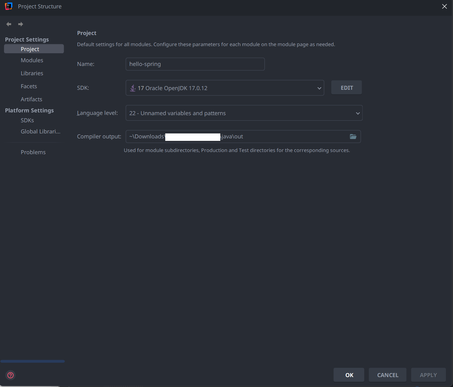 - Project Structure(Ctrl + Alt + Shift + s): SDK 17로 설정합니다.