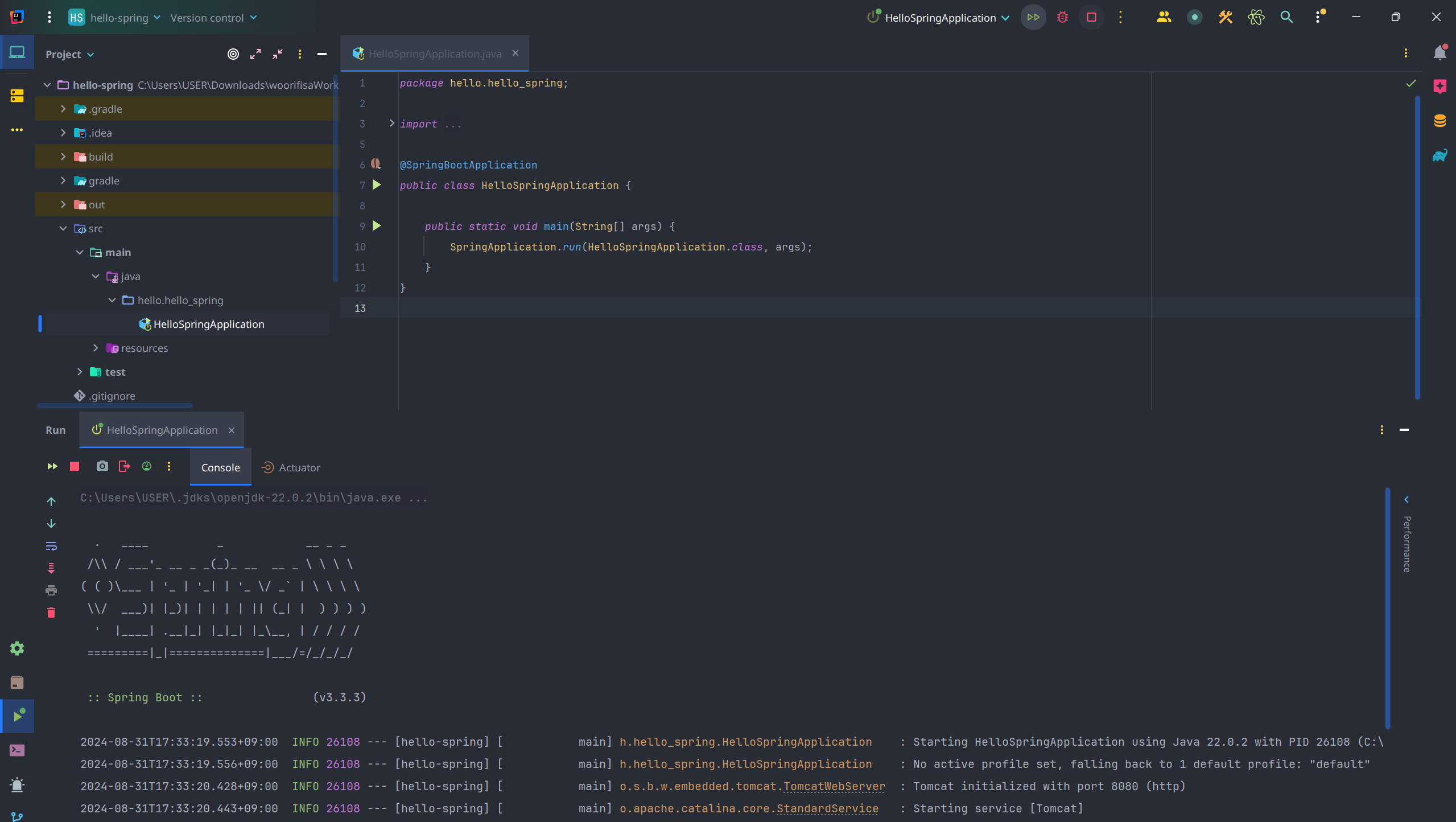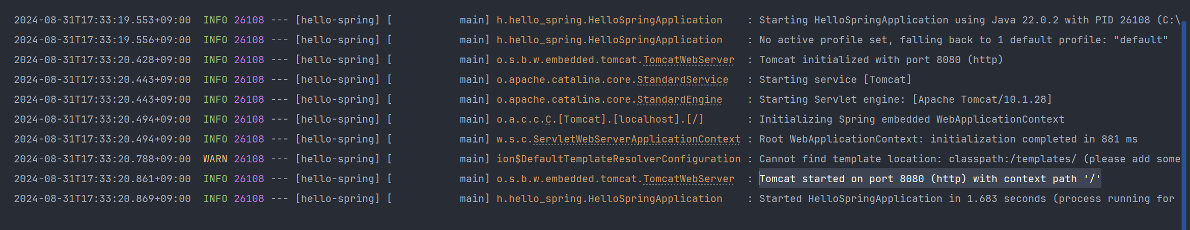 - hello-spring > src > main > java > hello.hello_spring > HelloSpringApplication을 실행합니다.