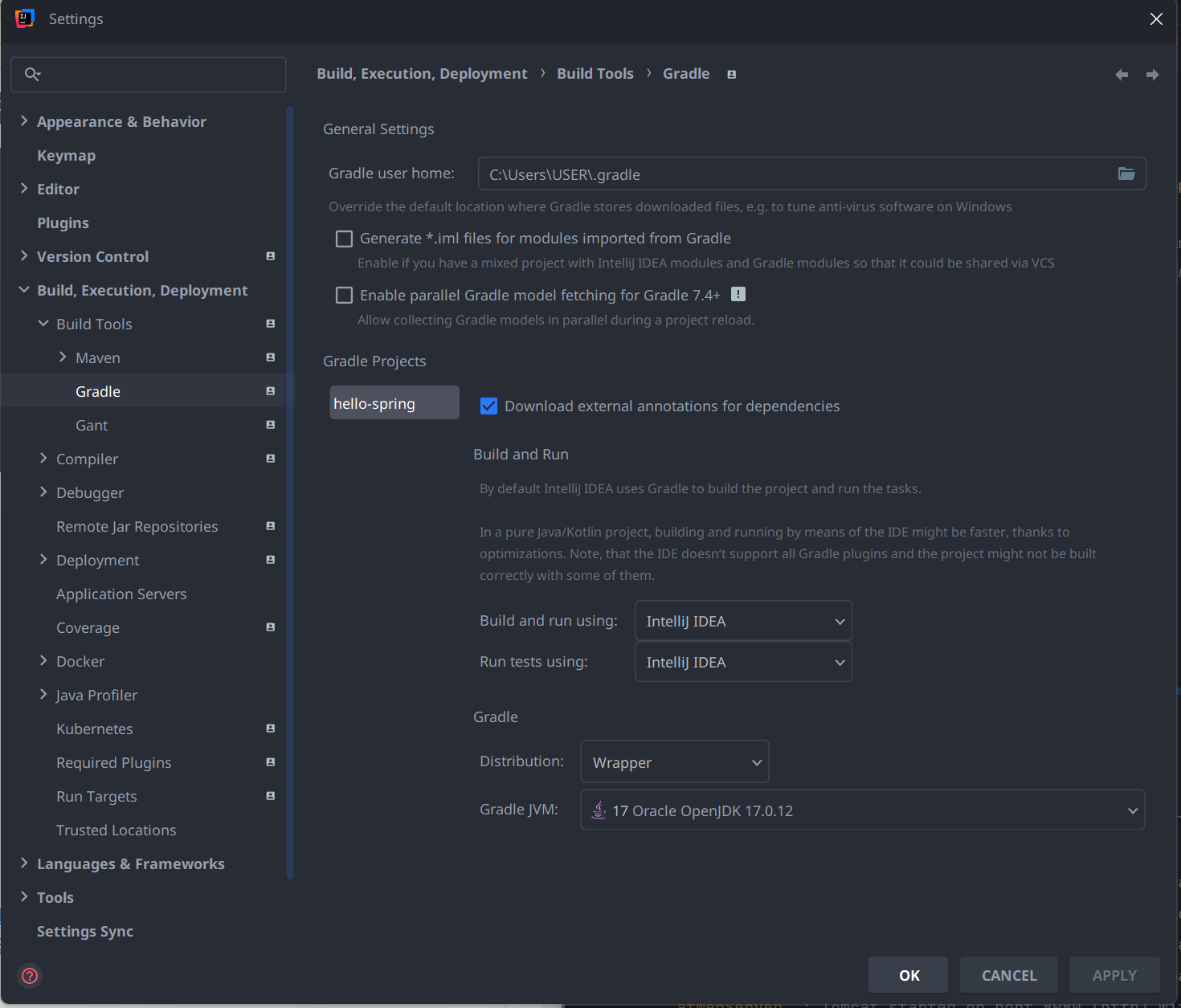 - Build and run using, Run tests using: IntelliJ IDEA로 설정합니다.