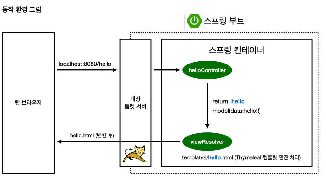 - 스프링 컨테이너에서 helloController에 있는 hello를 return "hello";