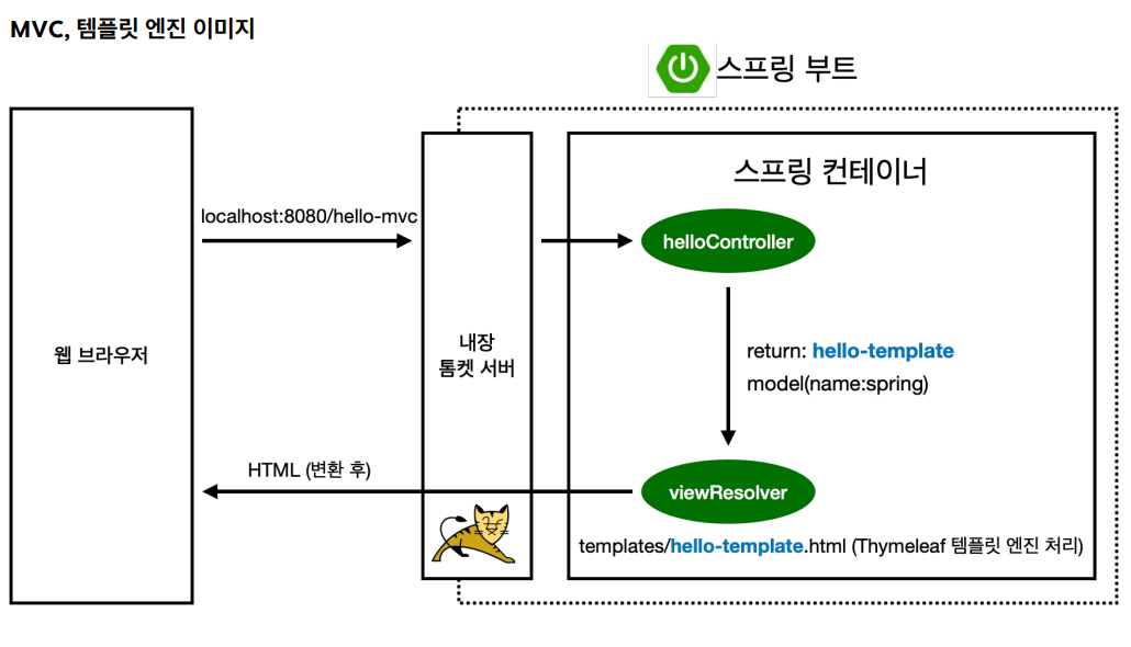 - 이 내용을 받아서 viewResolver가 동작하고, templates/hello-template.html 타임리프 템플릿 엔진에게 처리 요청합니다.
