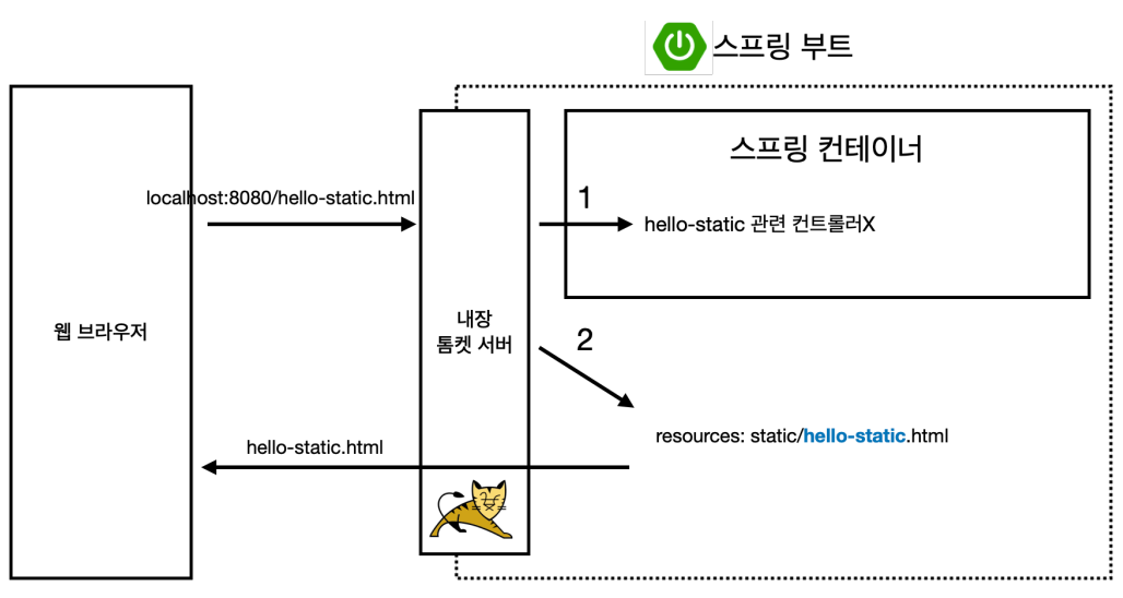 - 웹 브라우저에서 localhost:8080/hello-static.html을 치면 내장 톰캣 서버가 이 요청을 받습니다.