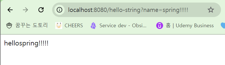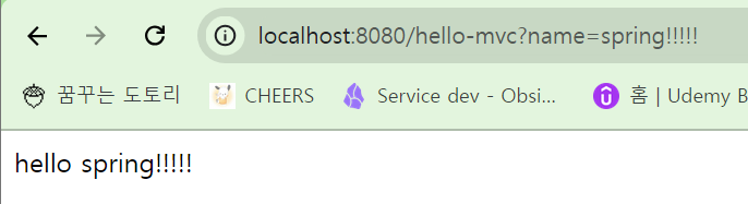 - 웹 브라우저에서 localhost:8080/hello-mvc?name=spring!!!!! → 내장 톰캣 서버에서 이 내용이 스프링 부트로 전달됩니다.