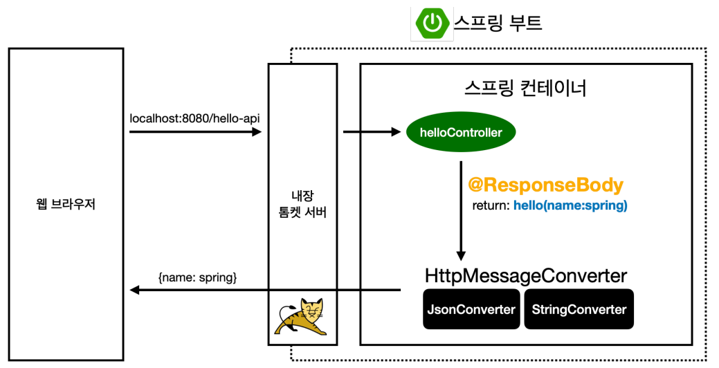 - 웹 브라우저에서 localhost:8080/hello-api를 받으면, 톰캣이 스프링에 전달합니다.