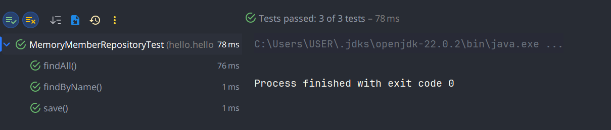 - test > java > hello > hello.hello_spring > repository 패키지 생성 > MemoryMemeberRepositoryTest 클래스 생성