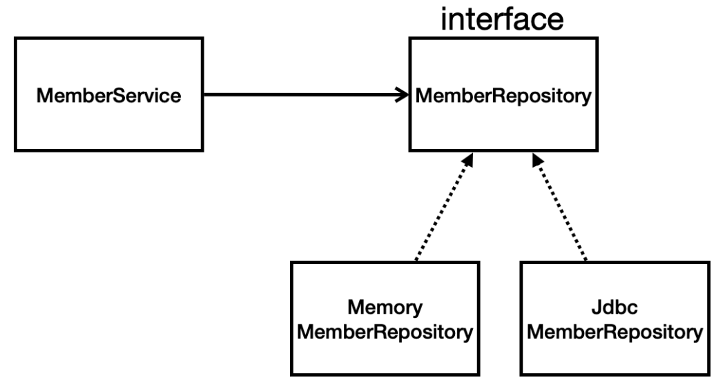 - MemberService → interface: MemberRepository를 의존하고 있습니다.