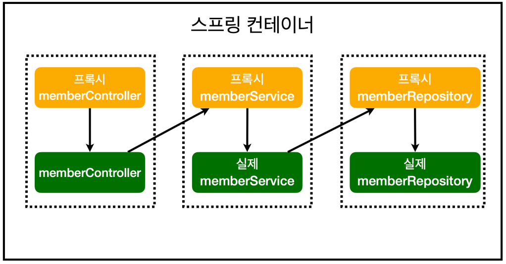 - 컨테이너에 스프링 빈을 등록할 때 프록시 스프링 빈을 앞에 세워둡니다. joinPoint.proceed()를 하면 그때 실제 memberService 즉 실제 스프링 빈이 호출됩니다.