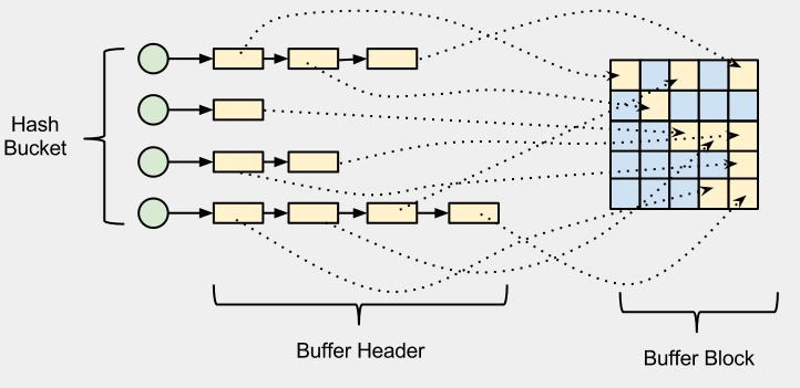 - Hash Bucket은 Buffer Header 목록(=Hash Chain)을 참조, 각 Buffer Header는 특정 Buffer Block을 가리킵니다.